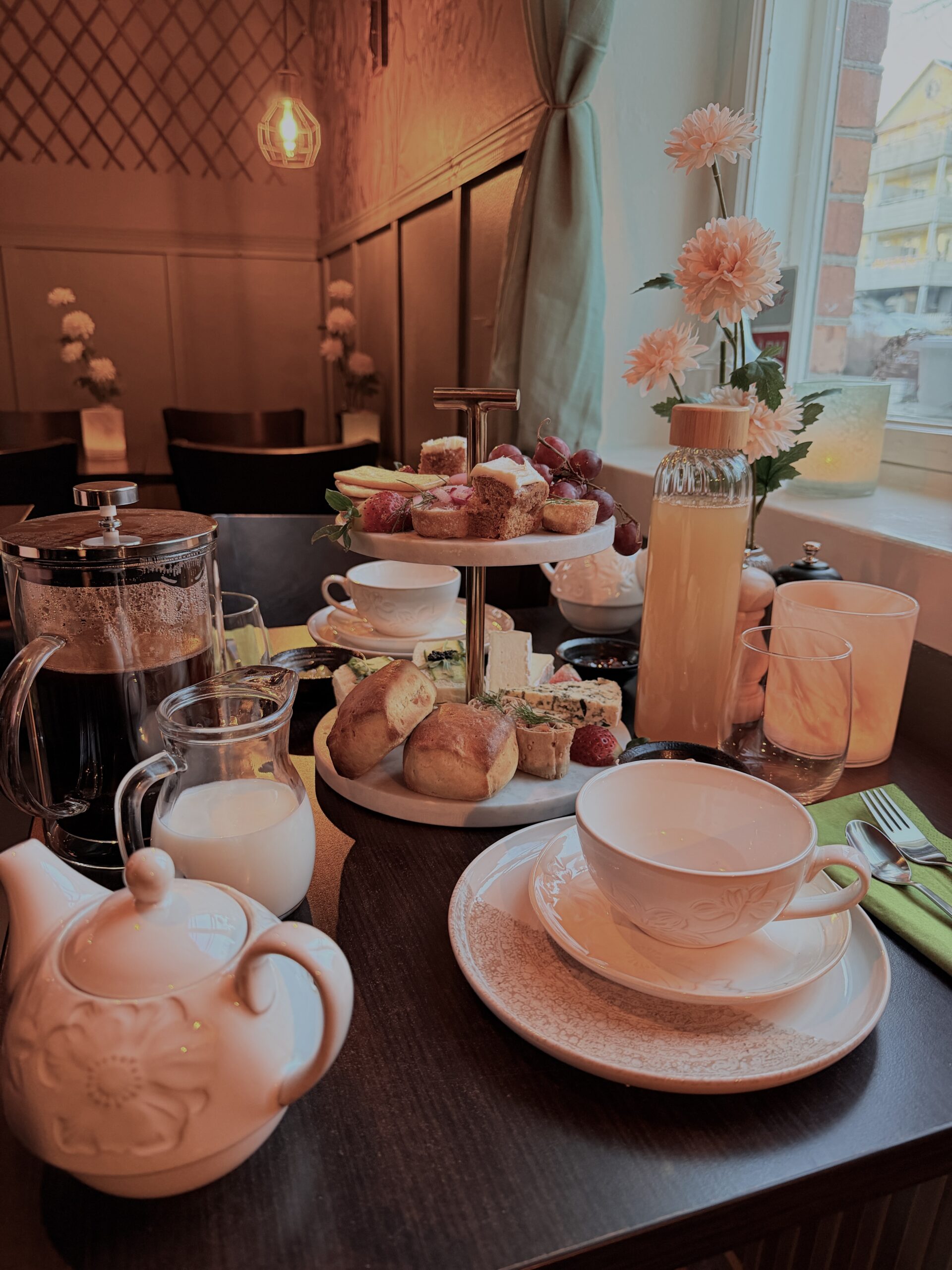 Afternoon Tea serveras mellan 14–17 och bokas på förhand 24 timmer innan. Scones, sött och salt i fin form – med möjlighet att lägga till ett glas bubbel för den som vill göra det extra trevligt.